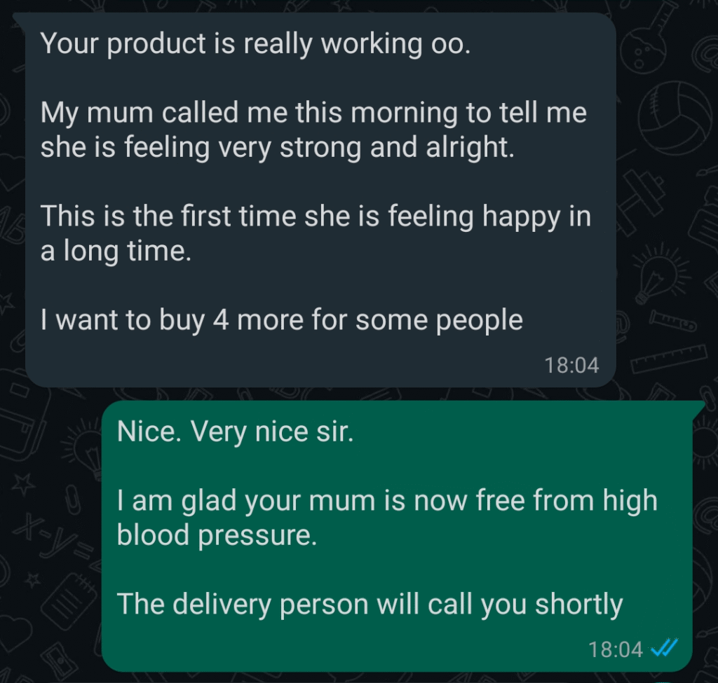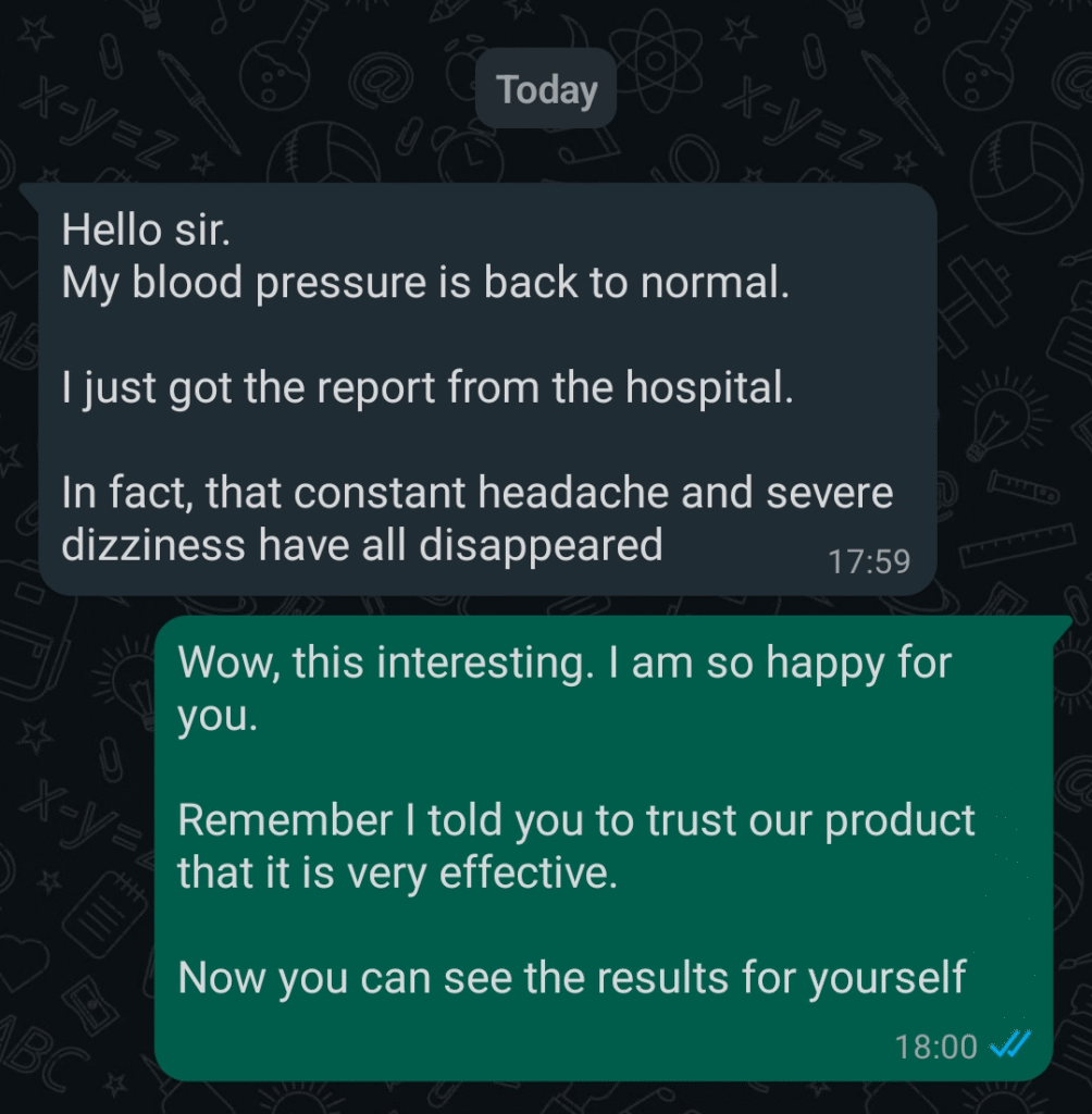 I knew i had high blood pressure but did not take it seriously. After sometime, i noticed i could not feel some parts of my body. This was when i knew i had stroke. At this time, i started looking for a solution. A friend of mine introduced this product to me. After using it, the partial stroke disappeared and the blood pressure also came back to normal.